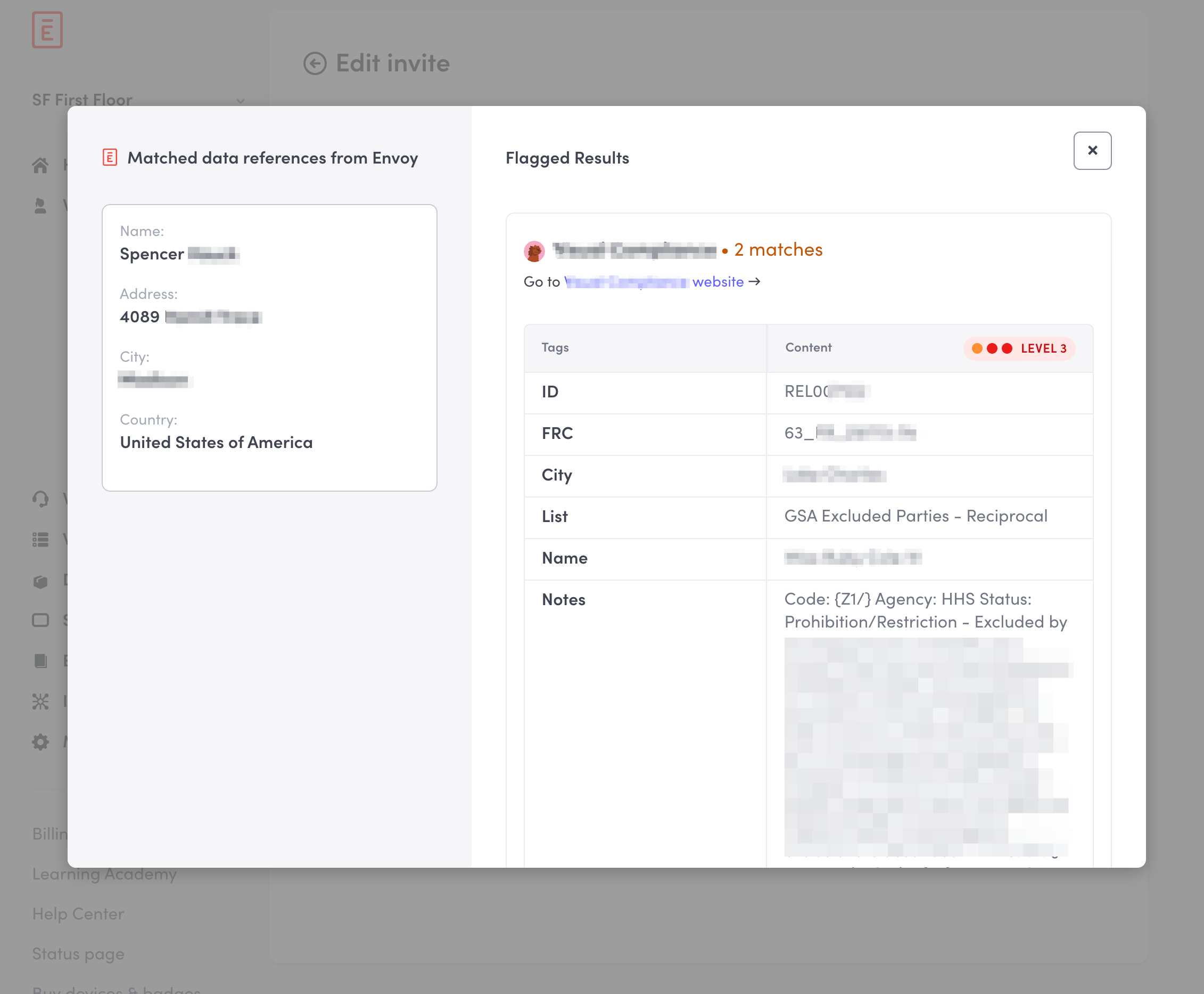 When your plugin processes an identity screening check and determines a visitor should be denied, you can attach screener details to the response. These details are displayed in a modal in the Envoy dashboard, allowing admins to review the screening results and make informed decisions.
